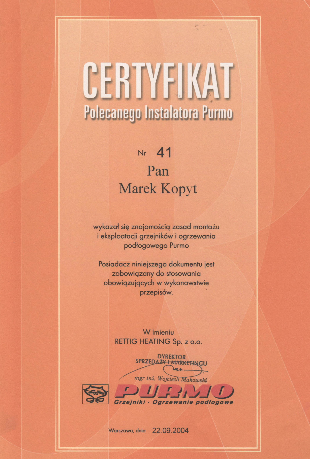 Jesteśmy jedną z kilkunastu firm na terenie województwa mazowieckiego zajmujących się montażem instalacji grzewczych grzejnikowych i ogrzewania podłogowego firmy Rettig Heating (PURMO) posiadających certyfikat polecanego instalatora.